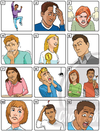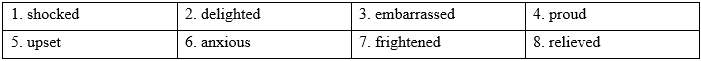anxious           delighted           embarrassed           frightened           proud           relieved           shocked           upset