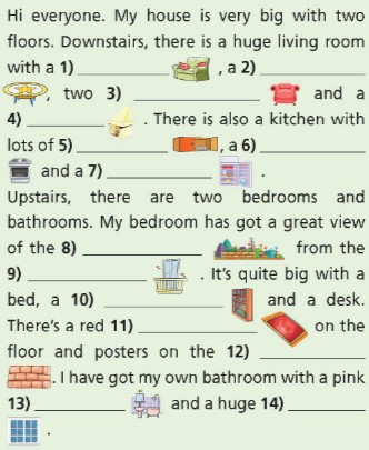 Hi everyone. My house is very big with two floors. Downstairs, there is a huge living room with a (1) sofa, a (2) coffee table, two (3) armchairs and a (4) fireplace. There is also a kitchen with lots of (5) cupboards, a (6) cooker and a (7) fridge. Upstairs, there are two bedrooms and bathrooms. My bedroom has got a great view of the (8) garden and from the (9) balcony. It’s quite big with a bed, a (10) bookcase and a desk. There’s a red (11) carpet on the floor and posters on the (12) wall. I have got my own bathroom with a pink (13) baths and a huge (14) window.