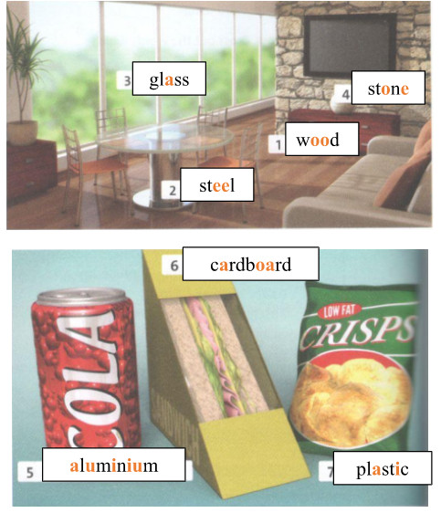 1. Complete the list of materials using a, e, i, o and u. 2. Complete the sentences with the correct materials. 3. Answer the questions with the material words from exercises 1 and 2. Use each word only once. 4. Match the words below with the diagrams. 5. Listen to the sentences and match the objects to the descriptions. Write the correct letter: A, B or C.
