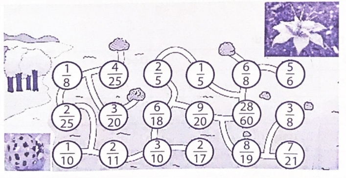 Đường về nhà của bọ rùa phải đi qua những ô có viết các phân số từ bé đến lớn. Hãy chỉ đường cho bọ rùa bằng cách tô màu vào đường đi đó.