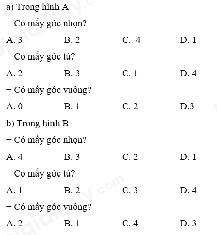 Quan sát hình vẽ và dựa vào tính chất của các góc để xác định góc nhọn, góc tù, góc bẹt.