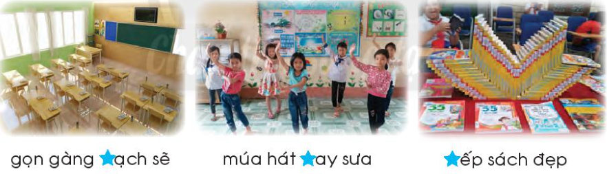 Em thấy những gì trong bức tranh dưới đây. Buổi học cuối năm. Tìm trong bài đọc tiếng có vần iu, ui, uôi. Bài đọc cho biết cả lớp náo nức chờ điều gì. Đọc lời của chích chòe, nhạn bé, chào mào. Viết: Xuân qua, hè tới, phượng nở đỏ sân trường. Thay hình ngôi sao bằng chữ s hoặc chữ x. Nói với bạn về một buổi học em thích theo các gợi ý. Hát bài Chúng em là học sinh lớp Một (Phạm Tuyên).