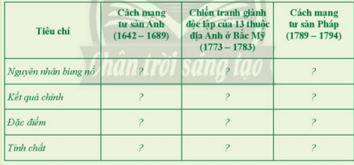 Hoàn thành nội dung của các cuộc cách mạng tư sản tiêu biểu ở Anh, Mĩ, Pháp theo mẫu dưới đây.