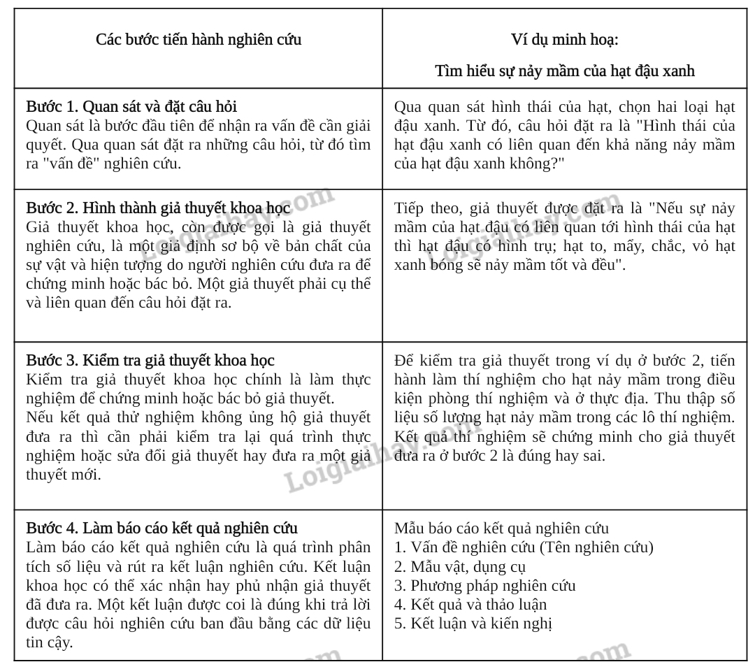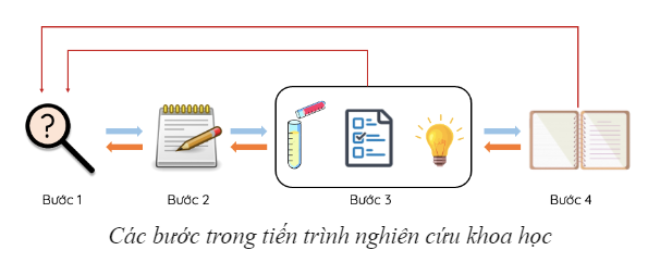 Quan sát và đặt câu hỏi → Hình thành giả thuyết khoa học → Kiểm tra giả thuyết khoa học → Làm báo cáo kết quả nghiên cứu