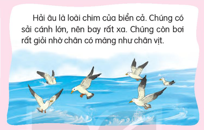 Hải âu là loài chim của biển cả. Chúng có sải cánh lớn, nên có thể bay rất ra, vượt qua cả những đại dương mênh mông. Hải âu còn bơi rất giỏi nhờ chân của chúng có màng như chân vịt.