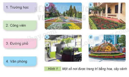 Hãy quan sát hình 1 và cho biết hoa, cây cảnh được dùng để trang trí ở những nơi nào bằng cách sử dụng các thẻ gợi ý dưới đây