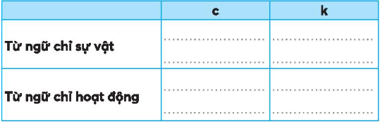 Tìm thêm từ ngữ chỉ sự vật, hoạt động có tiếng bắt đầu bằng c hoặc k