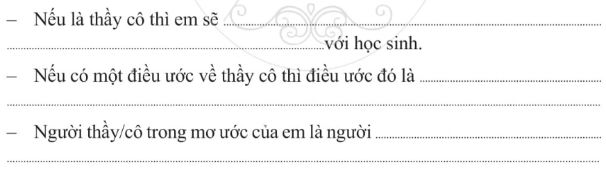 Hãy mô tả một thầy/cô mà em yêu mến theo các gợi ý. Trao đổi những mô tả với bạn và hãy đoán xem đó là thầy cô nào. Hãy thể hiện mong muốn của bản thân với thầy cô bằng cách viết tiếp nội dung vào các chỗ trống. Hãy viết ba ấn tượng tốt của em về các thầy cô đã dạy em ở tiểu học. Hãy viết về những điều em thấy nuối tiếc khi chưa bày tỏ với thầy cô dạy em trước đây. Hãy mô tả các tình huống em gặp khó khăn trong giao tiếp với thầy cô. Cùng nhau thảo luận để đề xuất cách thức vượt qua các khó khăn