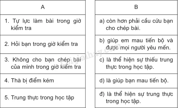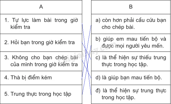 Nối mỗi ý ở cột A với một ý ở cột B để hoàn chỉnh một câu nói về chủ đề “Trung thực trong học tập”.