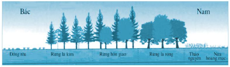 – Quan sát hình ảnh kết hợp với kí hiệu của các thảm thực vật và kênh chữ được thể hiện trong hình. Sau đó, cùng quan sát sự thay đổi của thảm thực vật từ Bắc xuống Nam (theo hình ảnh là từ trái sang phải).