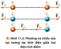 Phương của lực trùng với đường thẳng nối hai điện tích lại với nhau và chiều của lực tương tác giữa proton và electron hướng vào hai điện tích đó.