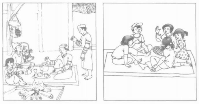 Em có thể thấy bức tranh thứ nhất vẽ cảnh gia đình. Vì có hình ảnh của ông, bố, mẹ, và em nhỏ đang ngồi uống nước tại bếp lửa.