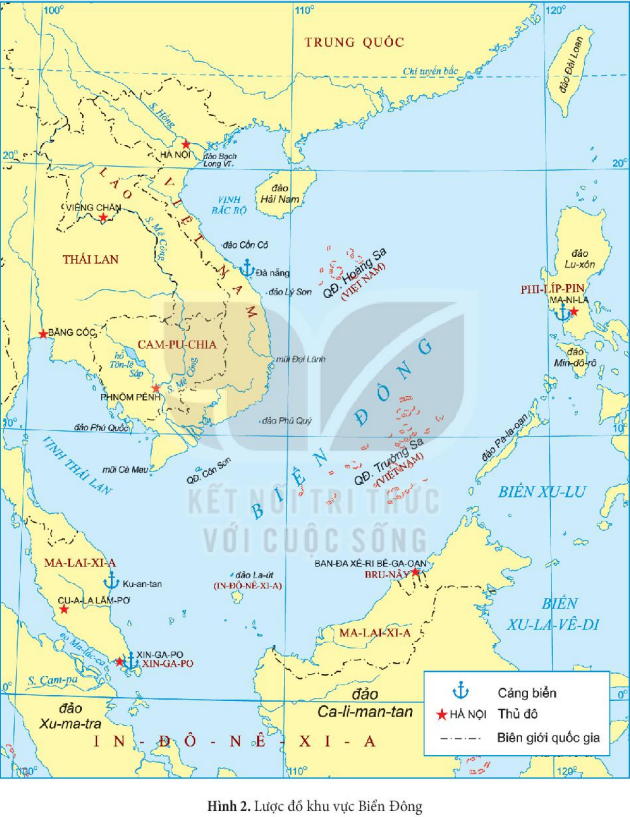 Quan sát lược đồ Hình 2 (tr.74) và dựa vào thông tin trong mục, xác định vị trí của Biển Đông. Kể tên các nước và vùng lãnh thổ tiếp giáp với Biển Đông.