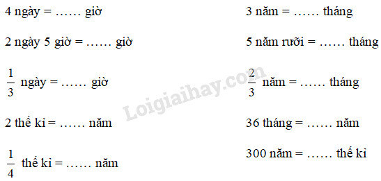 – 1 thế kỉ = 100 năm nên để đổi một số từ đơn vị thế kỉ sang đơn vị năm ta lấy số đó nhân với 100 và đổi một số từ đơn vị năm sang đơn vị thế kỉ ta lấy số đó chia cho 100.