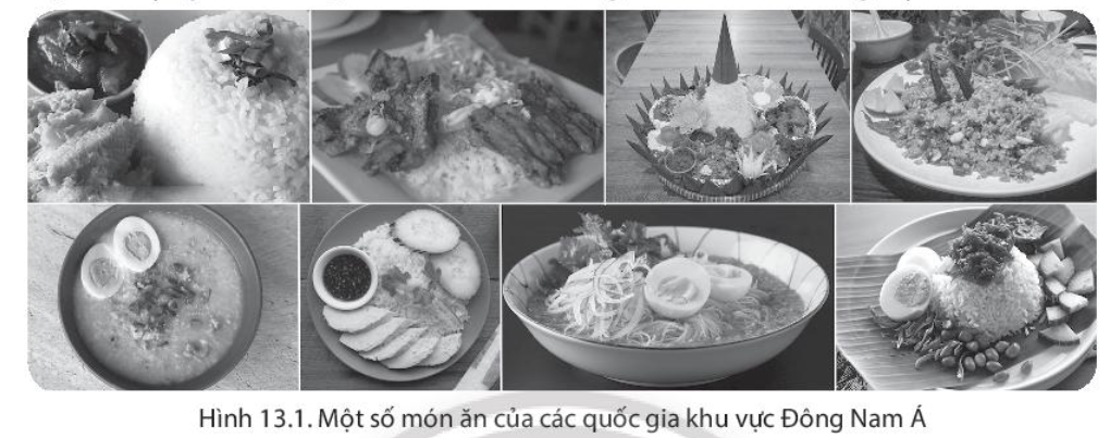 Câu 3. Hãy cho biết các món ăn truyền thống của cư dân Đông Nam Á trong hình được làm từ nguyên liệu chính gì và đã thể hiện tính thống nhất trong đa dạng như thế nào. Từ nguyên liệu chính đó, nêu đặc trưng quan trọng nhất chi phối văn minh Đông Nam Á cổ – trung đại.
