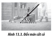 Một người đẩy máy cắt cỏ có khối lượng 15 kg di chuyển với một lực có độ lớn xem như không đổi bằng 80 N theo phương của giá đẩy như Hình 13.3. Biết góc tạo bởi giá đẩy và phương ngang là 450.