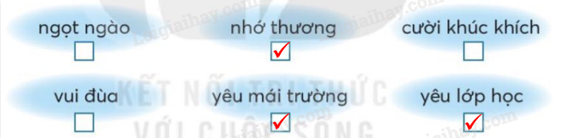 Em đọc kĩ bài đọc trong sách giáo khoa và tích vào ô trống dưới những từ ngữ thể hiện rõ nhất tình cảm của bạn nhỏ dành cho trường lớp.