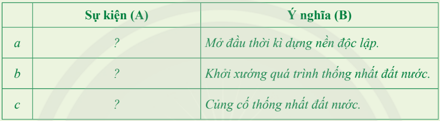 2. Hãy hoàn thiện các thông tin ở cột sự kiện (A) tương ứng với (B) theo nội dung dưới đây: