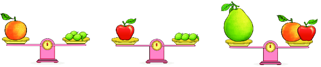 Quan sát tranh với đĩa cân để trả lời các câu hỏi của bài toán. Đĩa cân ở hai bên thăng bằng thì đồ vật trên hai đĩa cân nặng bằng nhau.