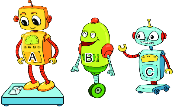 Ba chú rô-bốt rủ nhau đi cân. Rô-bốt A cân nặng 32 kg, rô-bốt B nặng hơn rô-bốt A là 2 kg, rô-bốt C nhẹ hơn rô-bốt A là 2 kg. Hỏi:
