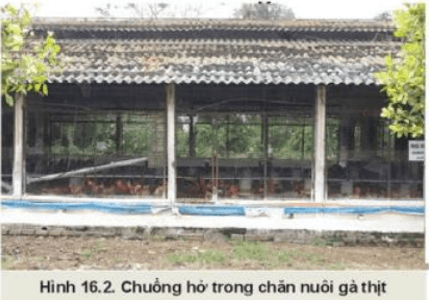 Quan sát Hình 16.2 và nêu những đặc điểm chính của kiểu chuồng hở trong chăn nuôi gà thịt.