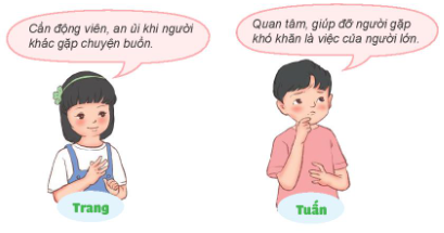 – Em đồng ý với ý kiến của Trang vì lời động viên của người khác có thể sẽ giúp người đang gặp chuyện buồn vượt qua được chuyện đó