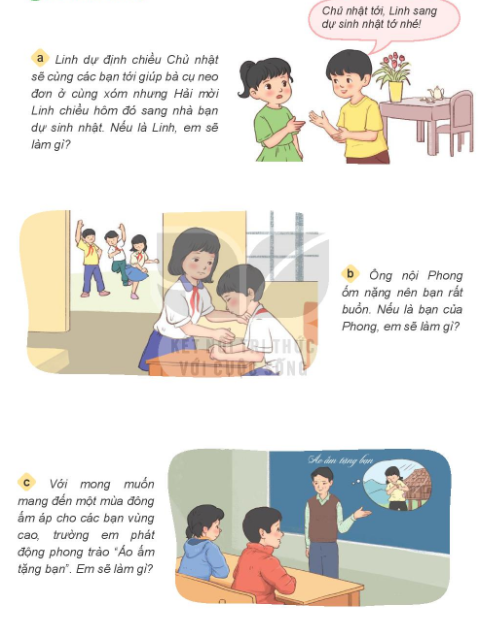 a. Nếu là Linh, em sẽ nói với Hải rằng mình đã có kế hoạch sang giúp bà cụ neo đơn trong xóm nên mong Hải thông cảm. Em sẽ gửi lời chúc mừng sinh nhật Hải