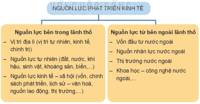 – Các nguồn lực đó có thể là: nguồn lực bên trong (vị trí địa lí, tự nhiên, kinh tế – xã hội) hay nguồn lực bên ngoài (vốn đầu tư nước ngoài, khoa học – công nghệ,…).