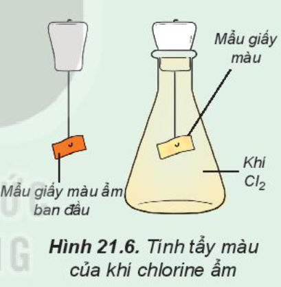 Đính một mẩu giấy màu ẩm vào thanh kim loại gắn với nút đậy bình tam giác. Sau đó, đưa mầu giấy vào bình tam giác chứa khí chlorine (Hình 21.6).