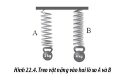 Hai lò xo A và B có chiều dài tự nhiên như nhau được treo thẳng đứng. Lần lượt treo vào đầu còn lại của hai lò xo các vật có khối lượng 2 kg và 4 kg (Hình 22.4) thì hai lò xo dãn ra và vẫn có chiều dài bằng nhau. So sánh độ cứng của hai lò xo.