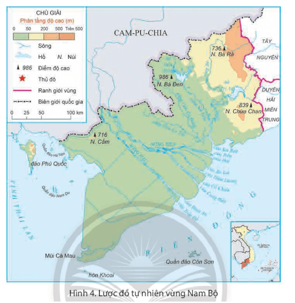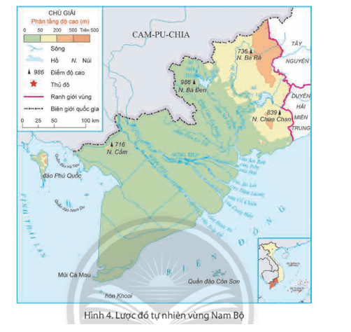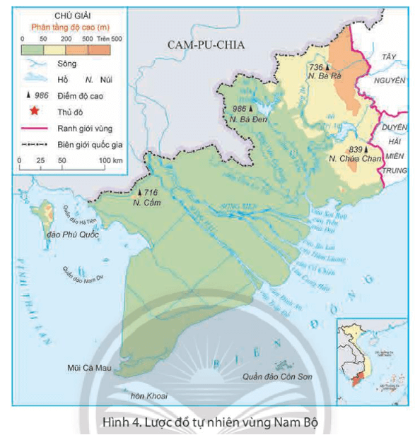 a. Quan sát hình 4 và đọc thông tin, em hãy xác định trên lược đồ các khu vực địa hình có độ cao: 0 – 50 m, 50 – 200 m, 200 – 500 m của vùng Nam Bộ. Khu vực nào có diện tích lớn nhất?