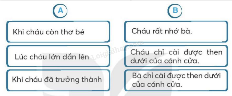Dựa vào bài đọc, nối ý ở cột A phù hợp với nội dung ở cột B. Sắp xếp các bức tranh theo thứ tự của 3 khổ thơ trong bài đọc. Đánh dấu vào ô trống dưới từ chỉ hoạt động. Nối những từ chỉ hoạt động có thể kết hợp với từ cửa. Viết một câu về nhân vật em thích trong câu chuyện Bà cháu.