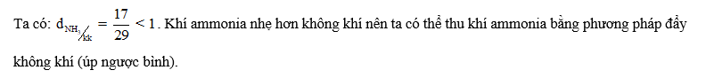 Tính tỉ khối của NH3 so với không khí. Từ kết quả đó, hãy giải thích vì sao có thể thu khí NH3 bằng phương pháp đẩy không khí (úp ngược bình).