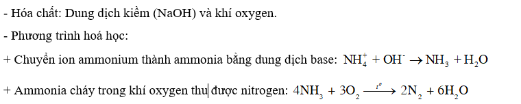 Khi thải rác thải sinh hoạt chứa một lượng lớn ion ammonium vào ao, hồ sẽ xảy ra quá trình oxi hoá ammonium thành ion nitrate dưới tác dụng của vi khuẩn. Quá trình này làm giảm oxygen hoà tan trong nước, gây ngạt cho sinh vật sống dưới nước. Người ta phải xử lí nguồn nước gây ô nhiễm đó bằng cách chuyển ion ammonium thành ammonia, rồi chuyển tiếp thành nitrogen không độc. Hãy đề xuất một số hóa chất để thực hiện quá trình trên và viết phương trình hoá học của các phản ứng xảy ra.