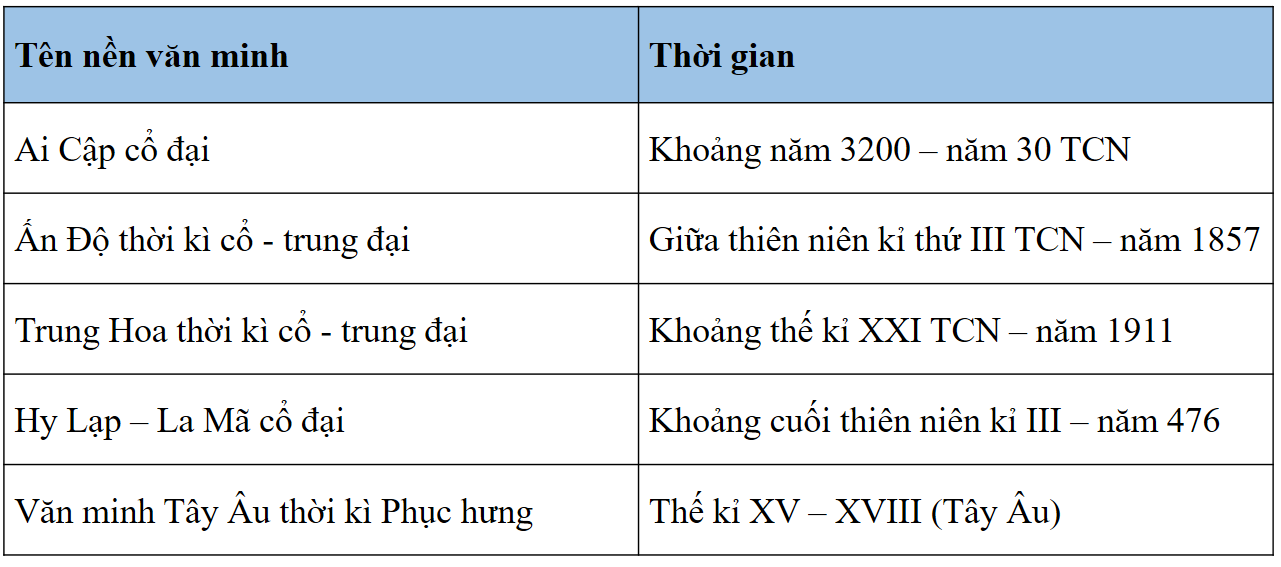 Những nền văn minh tiêu biểu trong tiến trình phát triển của văn minh thế giới cổ – trung đại ở phương Đông và phương Tây là: