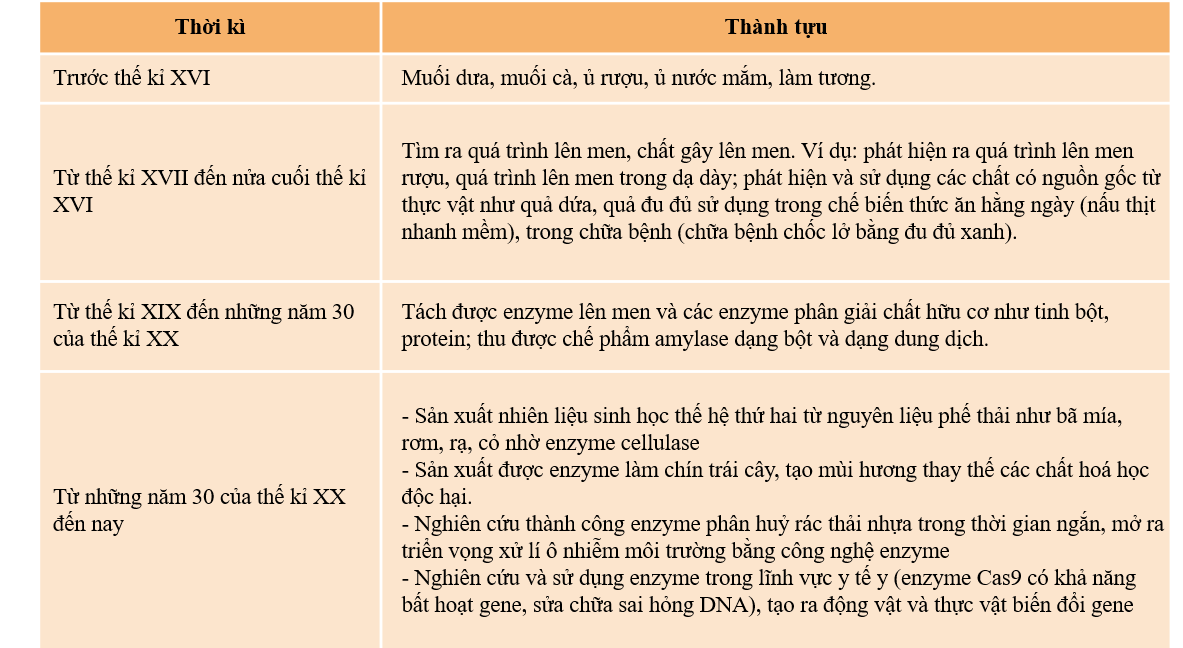 1. Em hãy liệt kê những thành tựu nổi bật của công nghệ enzyme qua các thời kì bằng cách hoàn thiện thông tin theo mẫu bảng dưới đây.