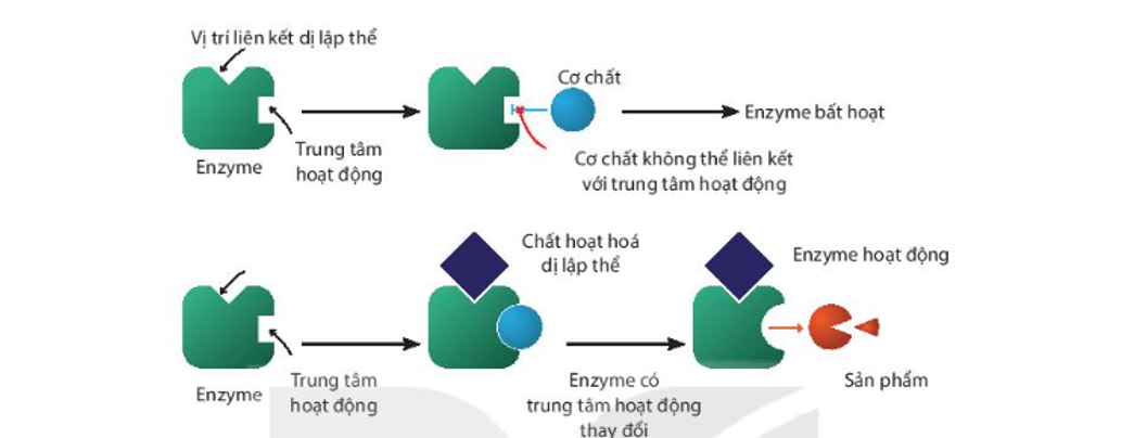 – Khi có chất hoạt hoá dị lập thể liên kết vào vị trí dị lập thể của enzyme, làm biến đổi cấu trúc của trung tâm hoạt động, trung tâm hoạt động lúc này tương thích với cơ chất, enzyme hoạt động xúc tác phản ứng để tạo ra sản phẩm.