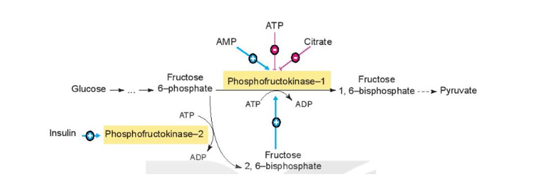 Phosphofructokinase-1 là enzyme quan trọng điều khiển quá trình đường phân, được hoạt hoá dị lập thể bởi AMP và fructose 2, 6–bisphosphate. Khi nồng độ hai chất này tăng sẽ xúc tác chuyển hoá fructose 6-phosphate. Ngược lại, ATP và citrate là chất ức chế enzyme phosphofructokinase-1 nên khi hai chất này tăng sẽ ức chế chuyển hoá fructose 6-phosphate. Fructose 6-phosphate dư thừa do không được chuyển hoá sẽ tạo thành fructose 2, 6-bisphosphate, chất này lại kích thích hoạt động của enzyme phosphofructokinase-1 giúp tăng cường chuyển hoá fructose 6-phosphate.