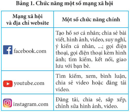 Dựa vào bảng 1 SGK: Chức năng một số mạng xã hội để chọn đáp án.