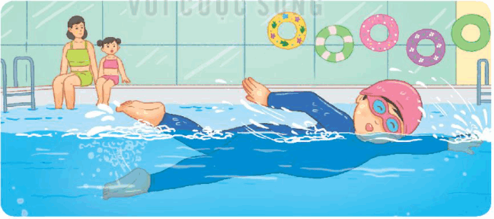 Hôm nay, mẹ đưa mình đi tập bơi. Mình rất phấn khích vì được mẹ chuẩn bị cho một chiếc mũ bơi cùng cặp kính bơi màu hồng rất đẹp. Cô giáo cũng khen đồ bơi của mình đáng yêu.