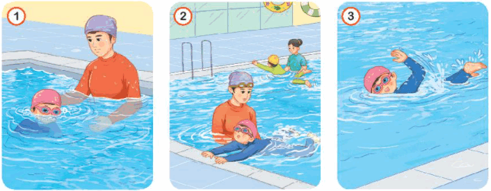 Em dựa vào các bức tranh minh họa và nhớ lại nội dung bài đọc để kể lại việc học bơi của bạn nhỏ.