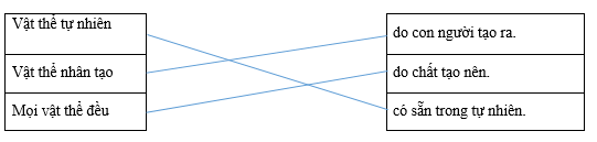 – Mọi vật thể đều do chất tạo nên. Vật thể có sẵn trong tự nhiên/ thiên nhiên được gọi là vật thể tự nhiên; Vật thể do con người tạo ra được gọi là vật thể nhân tạo.