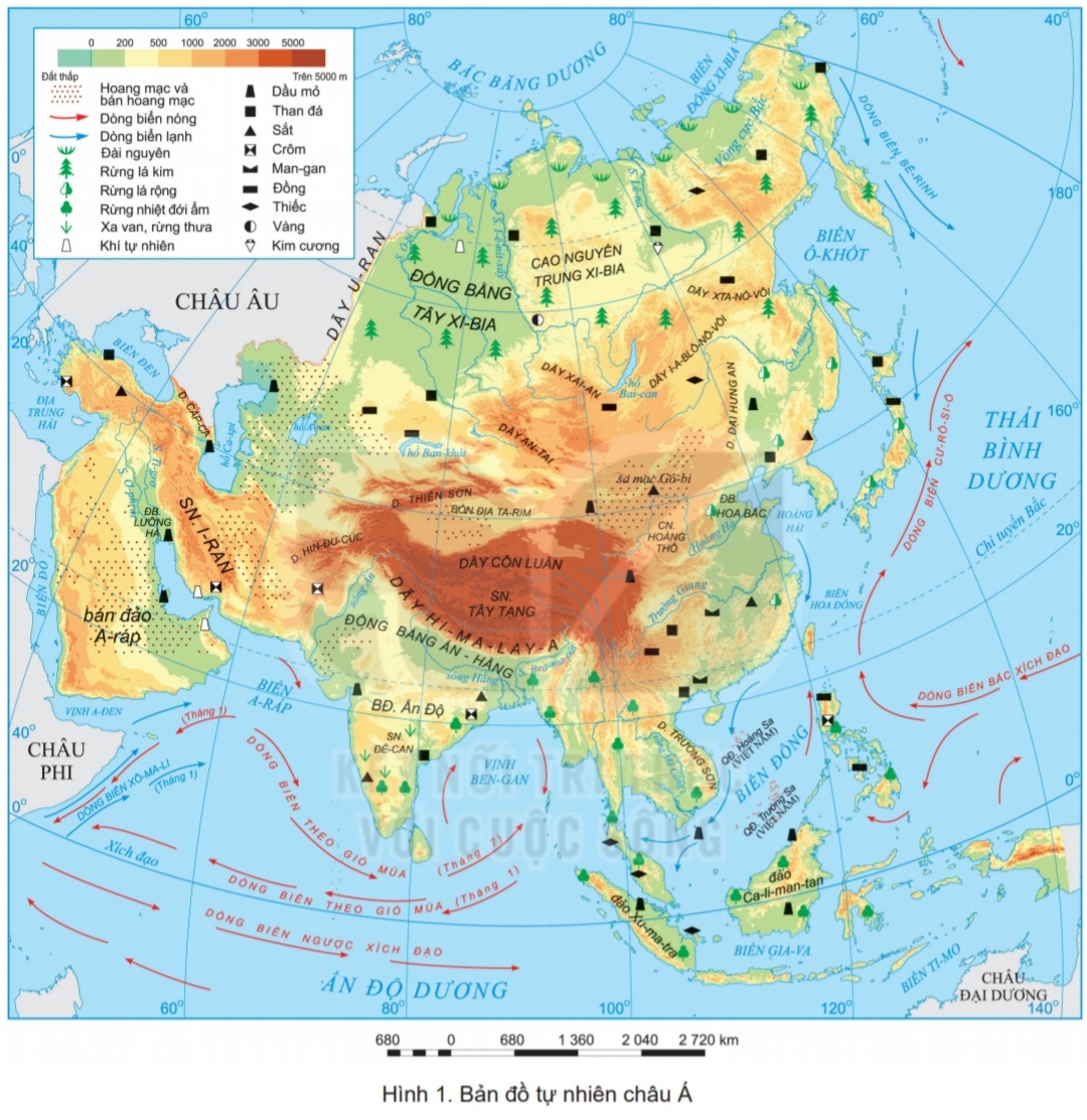 1. Xác định trên hình 1, vị trí phân bố một số loại khoáng sản chính ở châu Á.