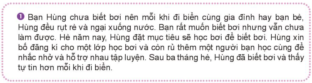 – Trường hợp 1. Việc có một mục tiêu rõ ràng đã giúp bạn Hùng đạt được kết quả là: biết bơi sau 3 tháng hè và Hùng đã cảm thấy tự tin hơn mỗi khi đi biển.