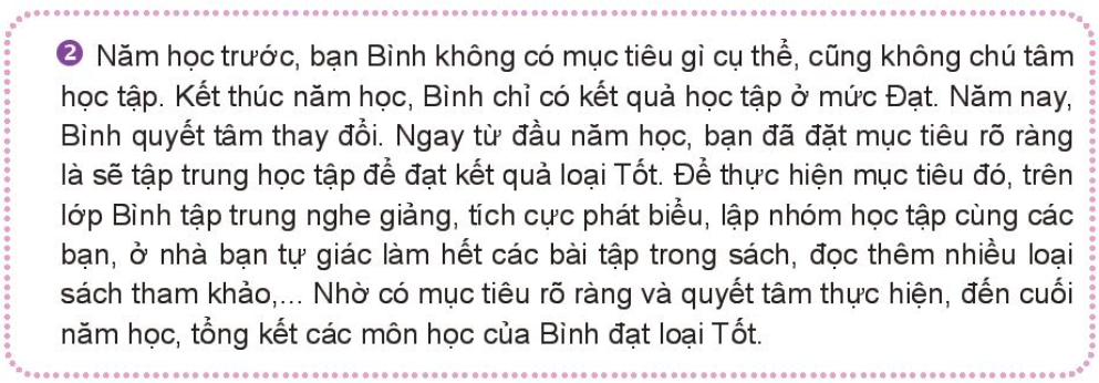 – Trường hợp 2. Nhờ có mục tiêu rõ ràng và quyết tâm thực hiện, đến cuối năm học, tổng kết các môn học của Bình đạt loại Tốt.