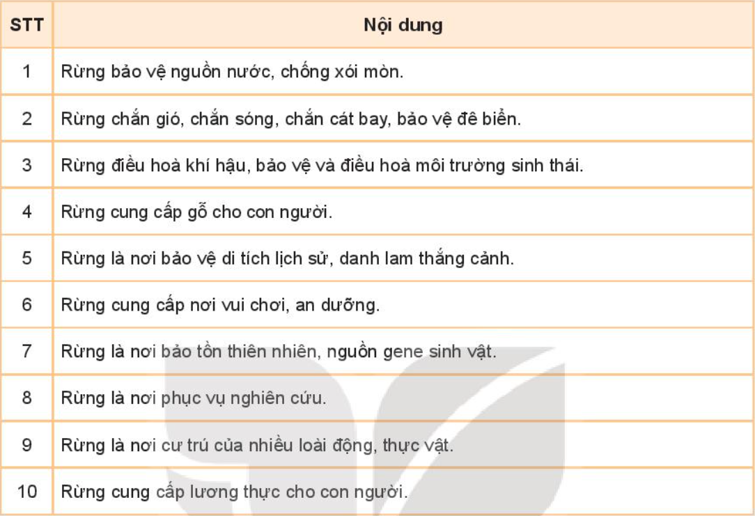 Chọn nội dung đúng về vai trò của rừng theo mẫu bảng dưới đây: