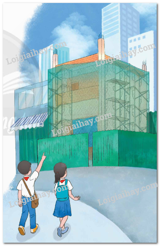 Bức tranh vẽ cảnh một ngôi nhà đang xây. Xa xa có các tòa nhà cao tầng. Có hai bạn học sinh đang chỉ tay và nói về ngôi nhà.