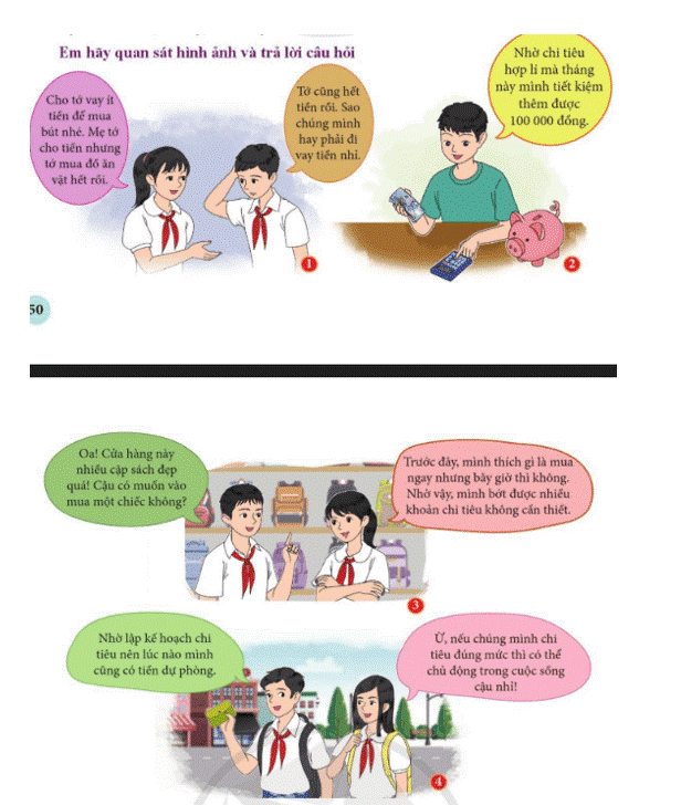 a) Em hãy quan sát mỗi hình ảnh và cho biết bạn học sinh nào chi tiêu có kể hoạch. Theo em, chi tiêu có kế hoạch sẽ mang lại lợi ích gì cho các bạn học sinh đó?