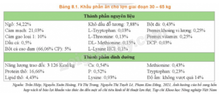– Từ bảng 8.1, ta thấy ngô, cám mạch, cám gạo là thành phần đáp ứng nhu cầu năng lượng.