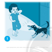 Bé gái trong hình cảm thấy sợ hãi khi bị 1 chú chó lao ra sủa.
